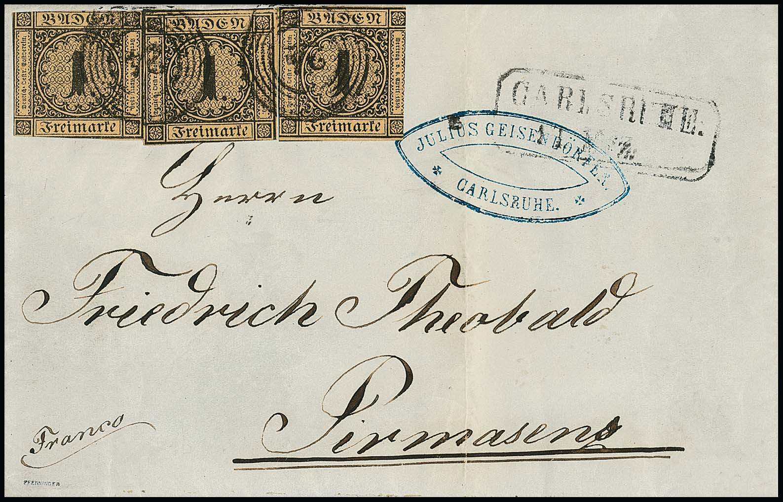 1 Kr. schw./bräunlich, drei ausgabetypisch teils berührt bzw. angeschnittene Exemplare auf Faltbrief 1855 von Carlsruhe nach Pirmasens