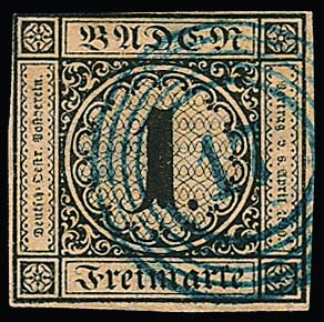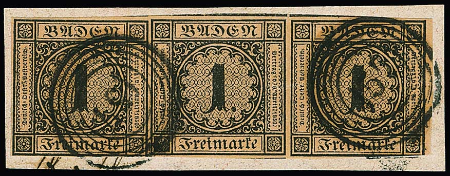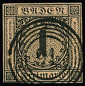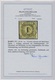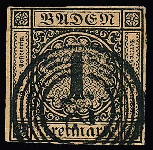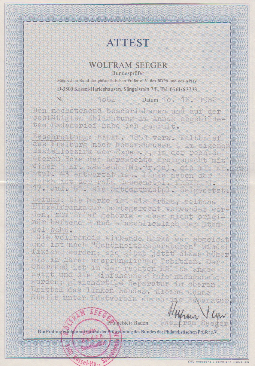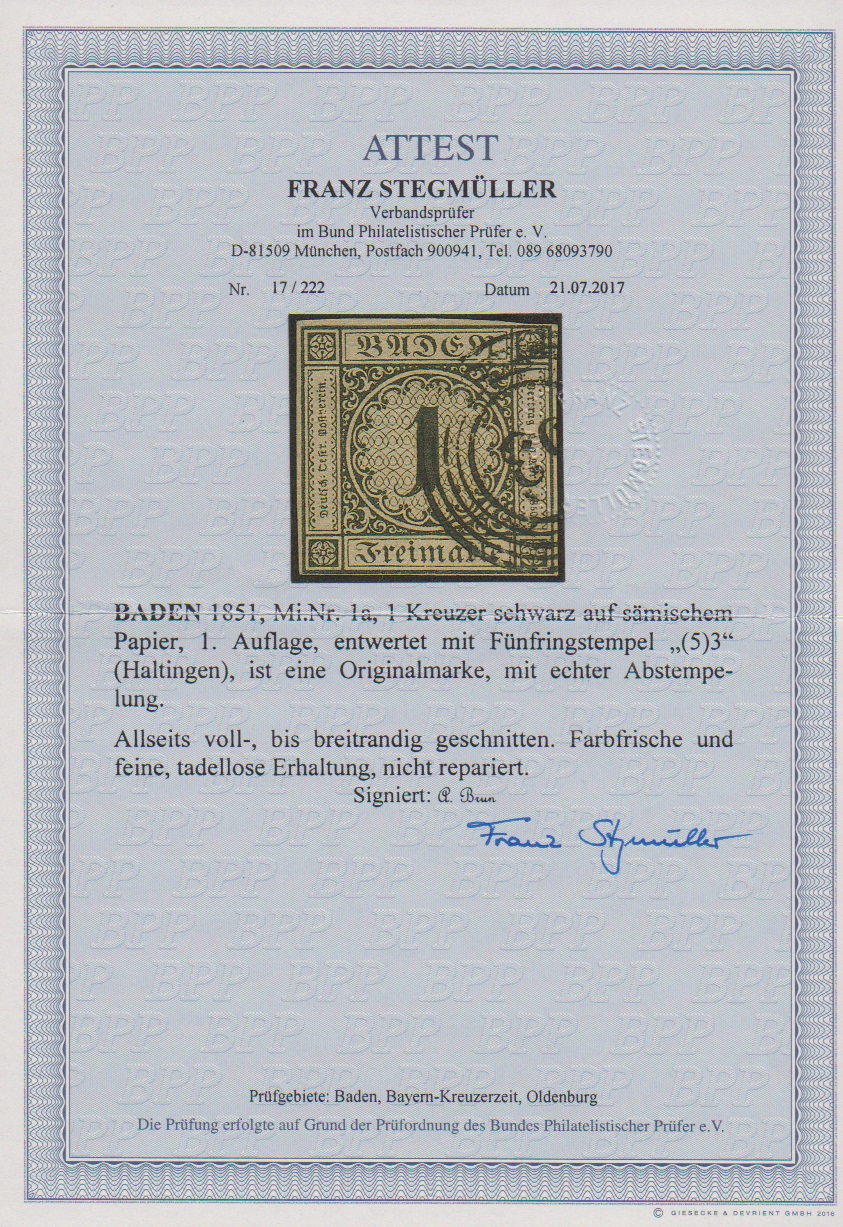 1 Kr. schw./sämisch, voll- bis meist breitrandiges Kabinettbriefstück mit NS "19"(Bruchsal), Mi. 1000,-, sign. Ressel und Attest Stegmüller "farbfrische und feine, tadellose Erhaltung"