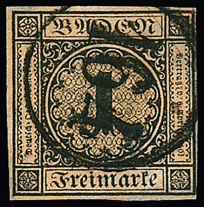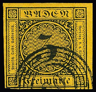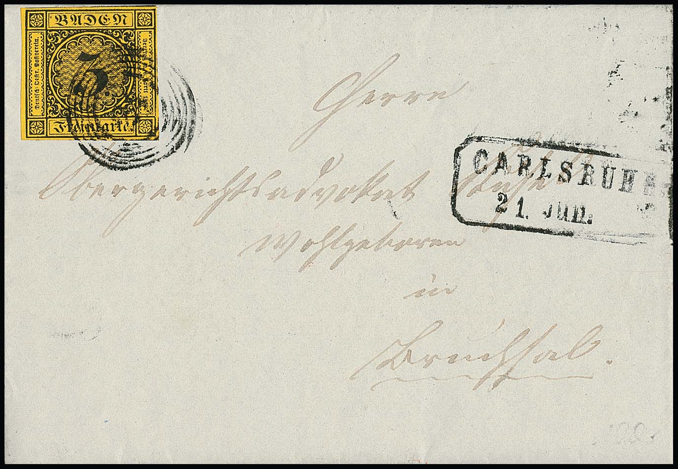 3 Kr. schw./dunkelgelb, allseits sehr breit- bis überrandig, auf Luxusbrief aus Carlsruhe 1852