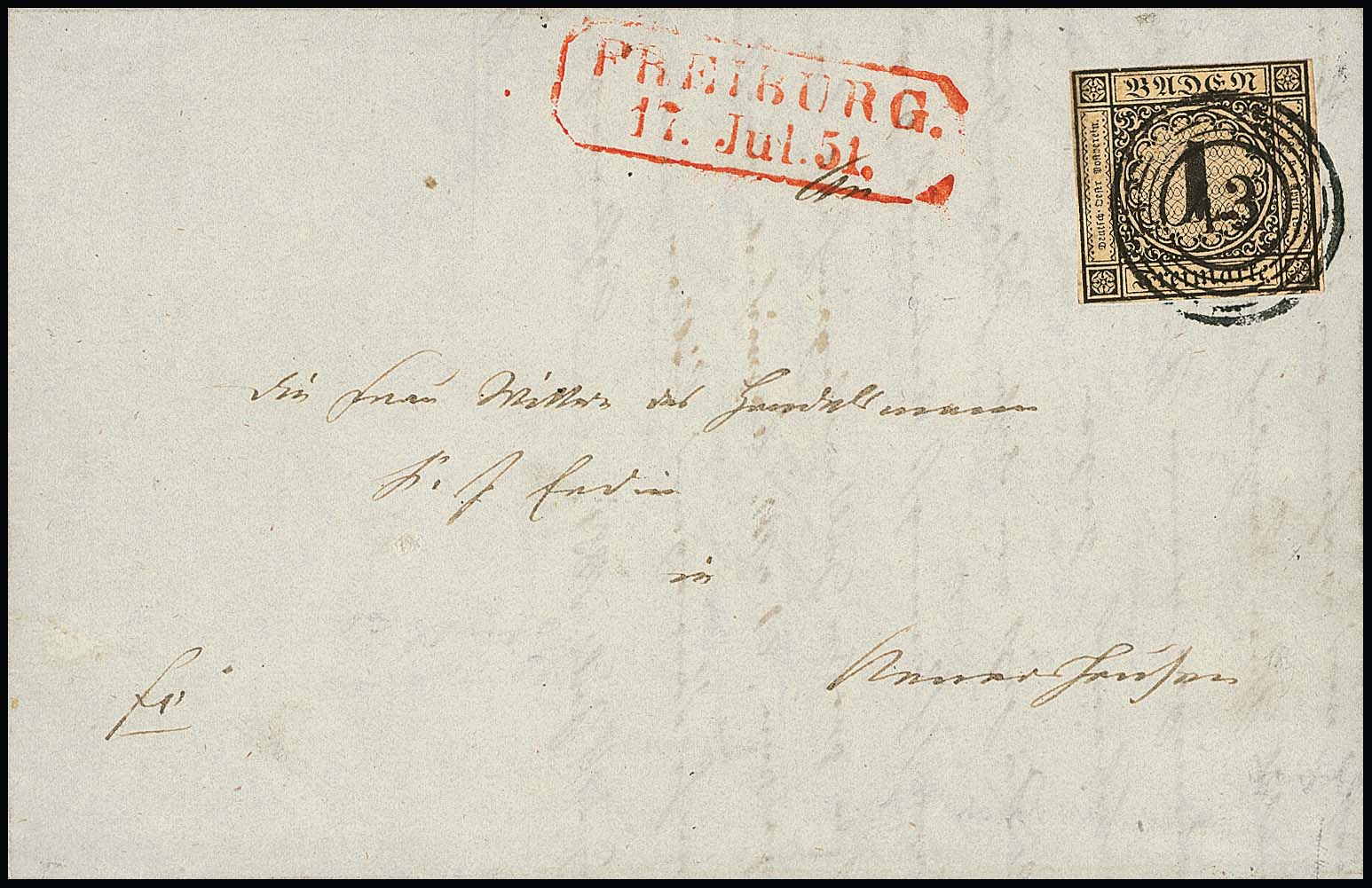 1 Kr. schw./sämisch einzeln auf frühem Brief mit NS "43" und rotem Ra2 "Freiburg 17. Jul. 51" in den eigenen Landbezirk nach Neuershausen. Je Randlinie links oben und rechts oben ergänzt, Attest Seeger. Mi. 2200,-