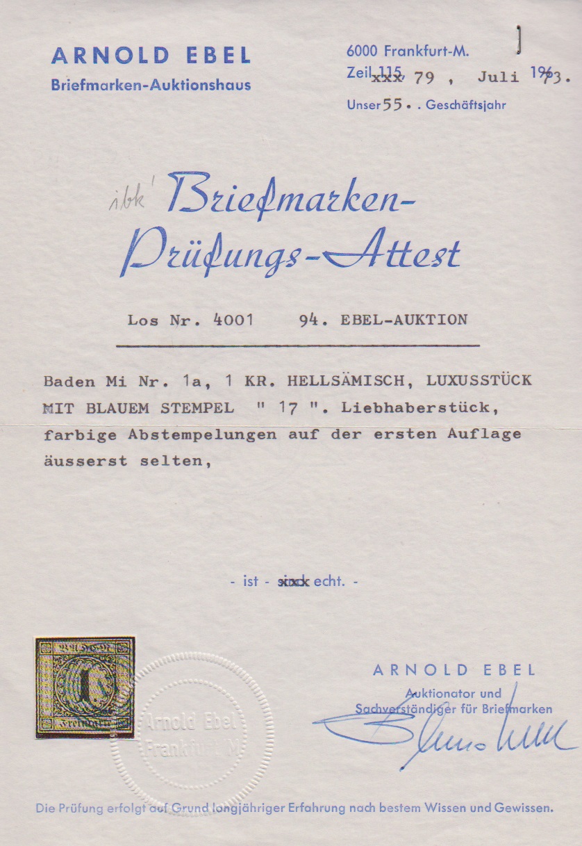 1 Kr. schw./sämisch, prachtvolles Exemplar (nur oben links winzig berührt) mit klarem blauem NS "17" (Boxberg). Sign. Seeger und Attest Ebel ("Luxusstück ... Liebhaberstück", 94. Auktion 1973)