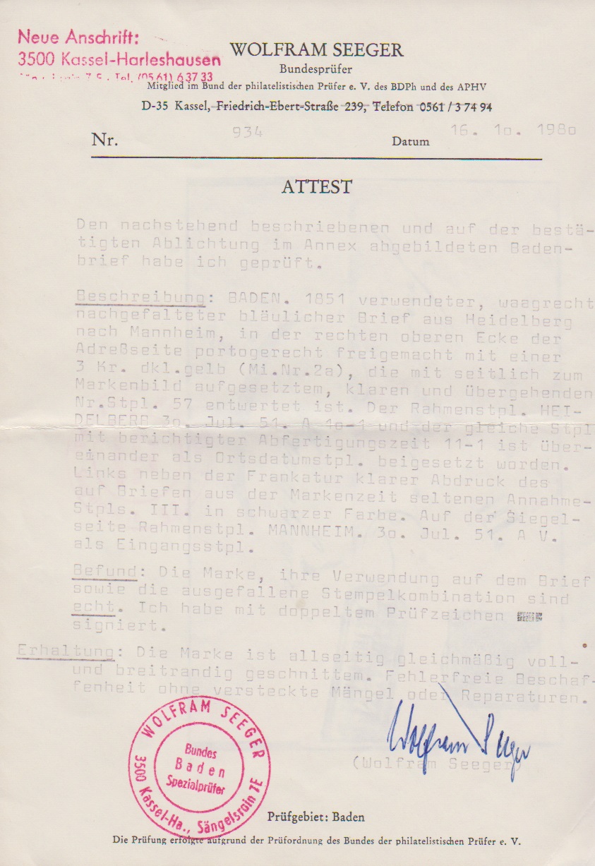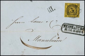 3 Kr. schw./dunkelgelb, Kabinettstück auf Faltbrief mit NS "57" und zweifachem Ra2 "Heidelberg" (30.7.1851), sowie seltenem Briefsammlungsannahme-Stempel "III". Attest Seeger