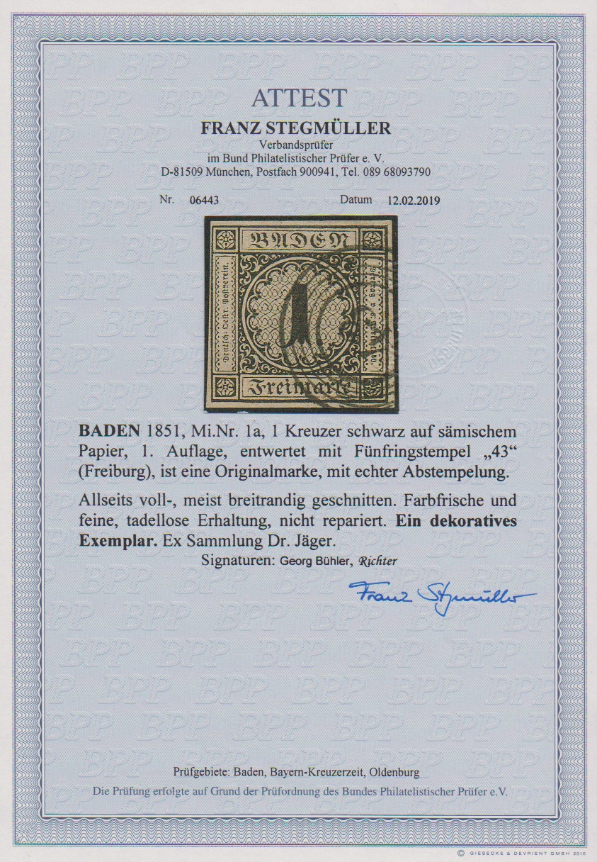 1 Kr. schw./sämisch, allseits voll- bis teils sehr breitrandiges Kabinettstück mit NS "43" (Freiburg). Mi. 1000,-, ex Slg. Dr. Jäger, u.a. sign. Bühler und Attest Stegmüller