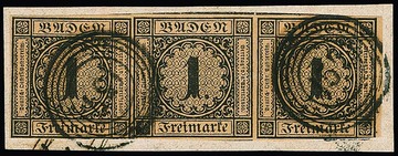 1 Kr. schw./bräunlich, waagerechter Dreierstreifen, teils überrandig, mit deutlicher Klischee-Verschiebung, auf Prachtbriefstück mit NS "157", sign. Englert. Mi. 1200,-