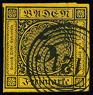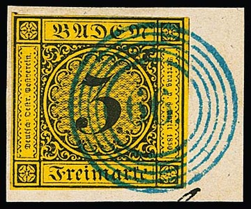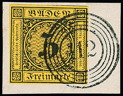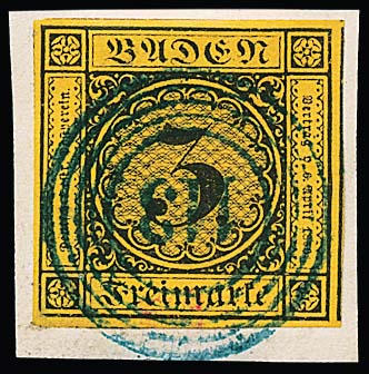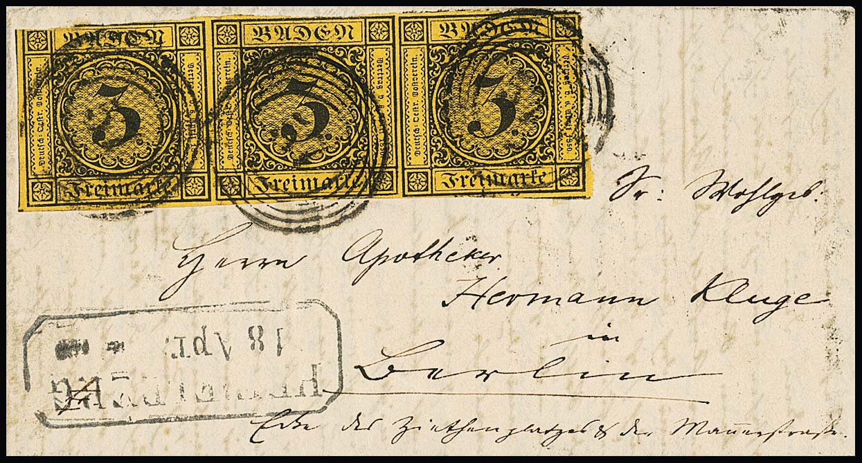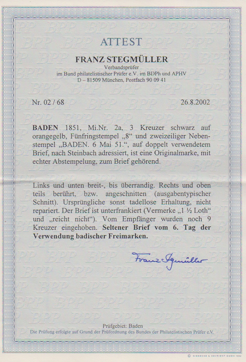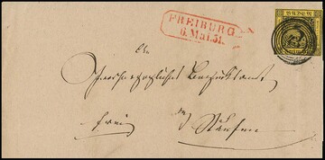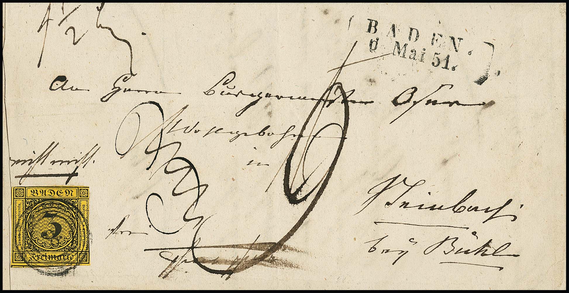 3 Kr. schw./dunkelgelb, teils vollrandig geschnitten, auf doppelt verwendetem Brief mit NS "8" und L2 "Baden" vom 6. Mai 1851. Unterfrankiert (Doppelbrief) und mit "9" Kr. nachtaxiert, innen markenlos mit blauem L2 "Bühl" gelaufen. Seltener Brief vom 6. Tag der Verwendung badischer Freimarken, Attest Stegmüller