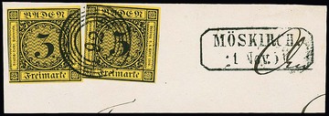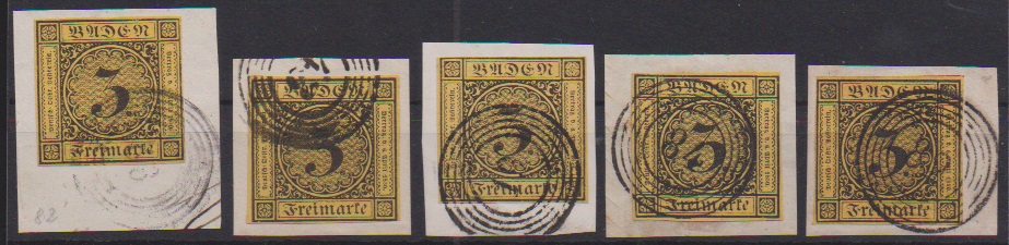 3 Kr. schw./dunkelgelb, fünf meist Pracht-/Kabinettbriefstücke, einmal per zwei mit NS "92" und Neben-Ra2 "Möskirch" (linke Marke Plattenfehler I)