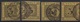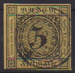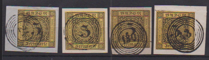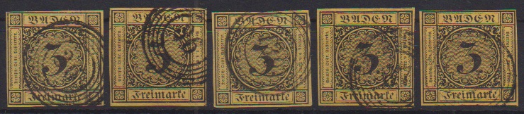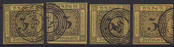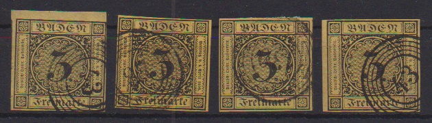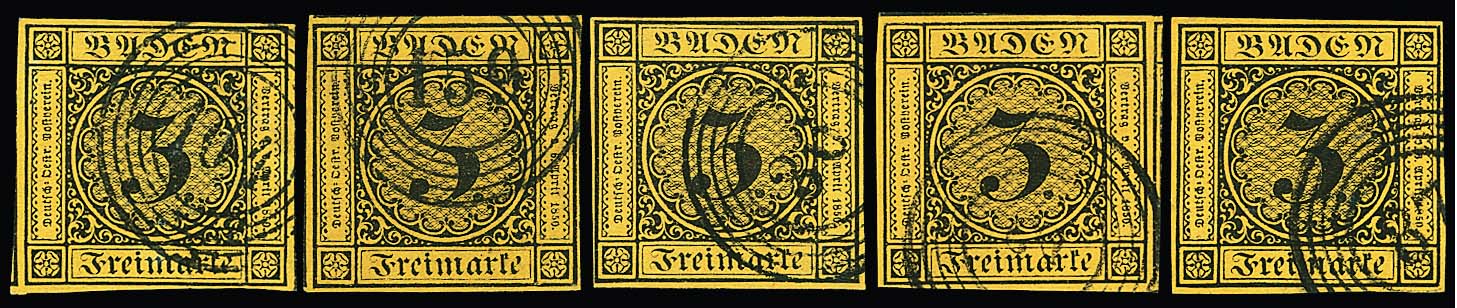 3 Kr. schw./dunkelgelb, sechs ausgesuchte Kabinettstücke, teils vom Rand, teils sign.