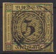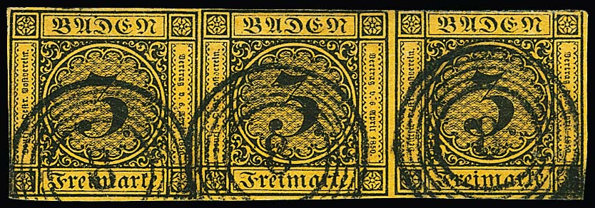 3 Kr. schw./dunkelgelb, waagerechter Dreierstreifen (teils oben angeschnitten, teils breitrandig) mit klarem NS "8", Mi. 700,-