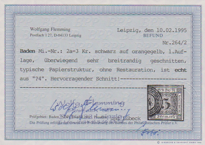 3 Kr. schw./dunkelgelb, sechs ausgesuchte Kabinettstücke, teils sign., eine Fotoexp. Flemming