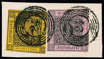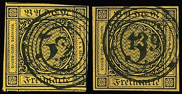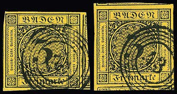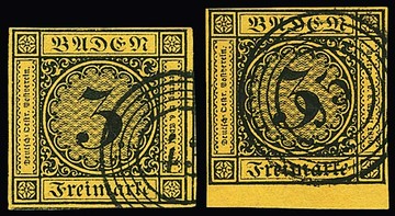 3 Kr. schw./dunkelgelb und auf gelb, je überrandige Luxusstücke, beide mit Teilen von Nebenmarken an drei Seiten