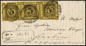 3 Kr. schw./dunkelgelb, waagerechter Dreierstreifen (teils angeschnitten) auf frischem kleinem Briefchen mit NS "57" und Ra2 "Heidelberg" nach Berlin