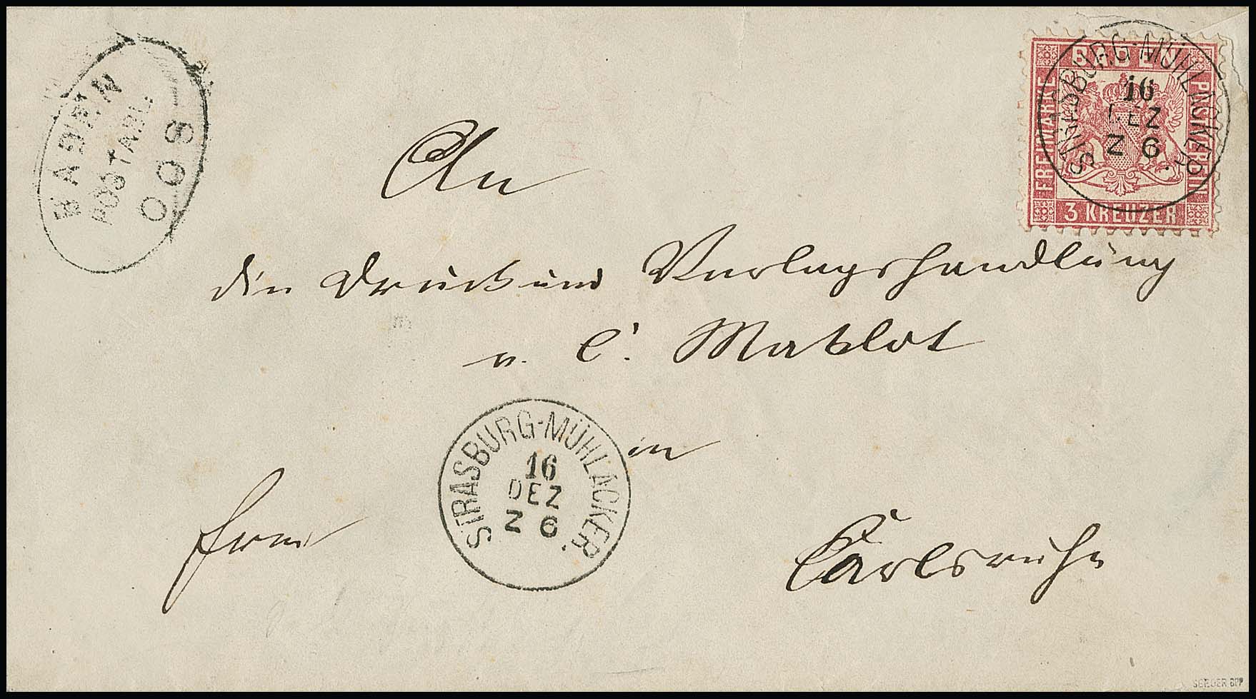 "Strasburg-Mühlacker", seltener Bahnpost-K1 als Markenentwertung, nebst Postablage "Baden-Oos", auf Couvert (dieses min. Randmgl.) mit Kabinettstück 3 Kr. rosa, sign. Seeger