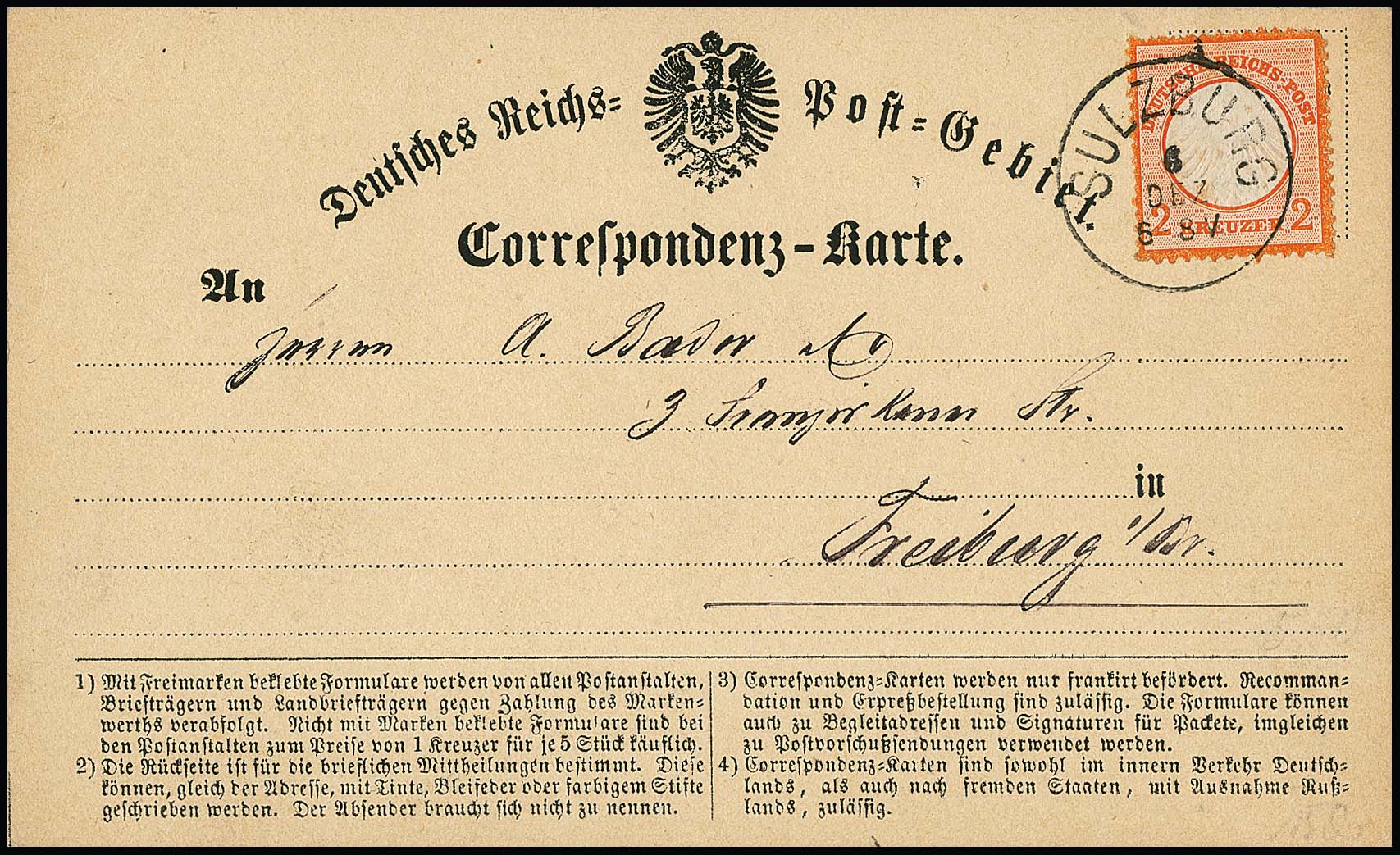 "Sulzburg", klarer nachverw. K1 auf frischer Postkarte mit üblich gezähnter 2 Kr. kl. Brustschild