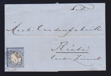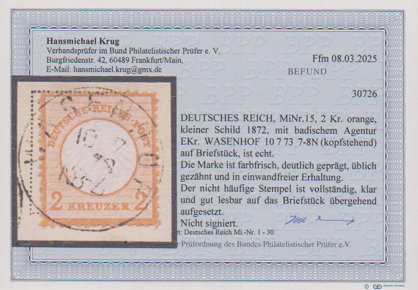 "Wasenhof", seltener neuer badischer Agentur-K1 (mit kopfstehender Uhrzeit) auf Kabinettbriefstück 2 Kr. kl. Brustschild, Fotoexp. Krug