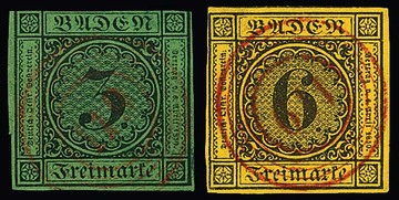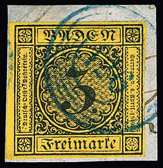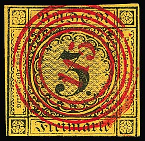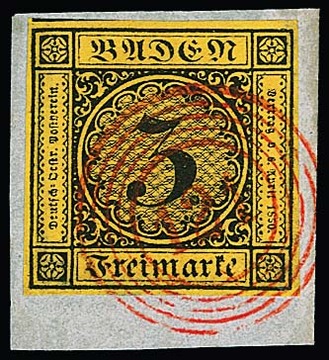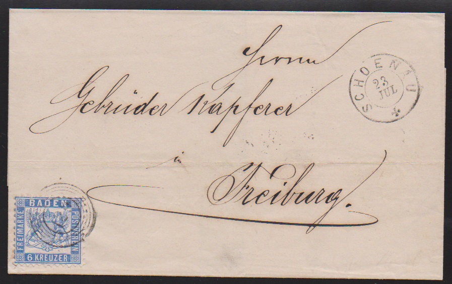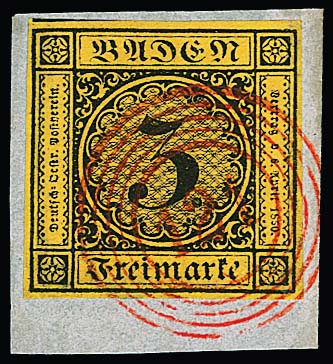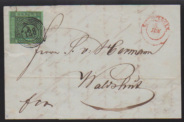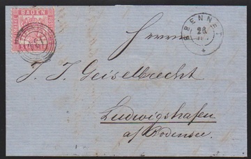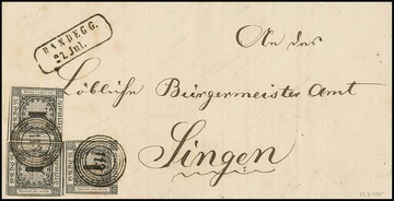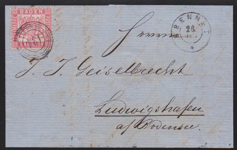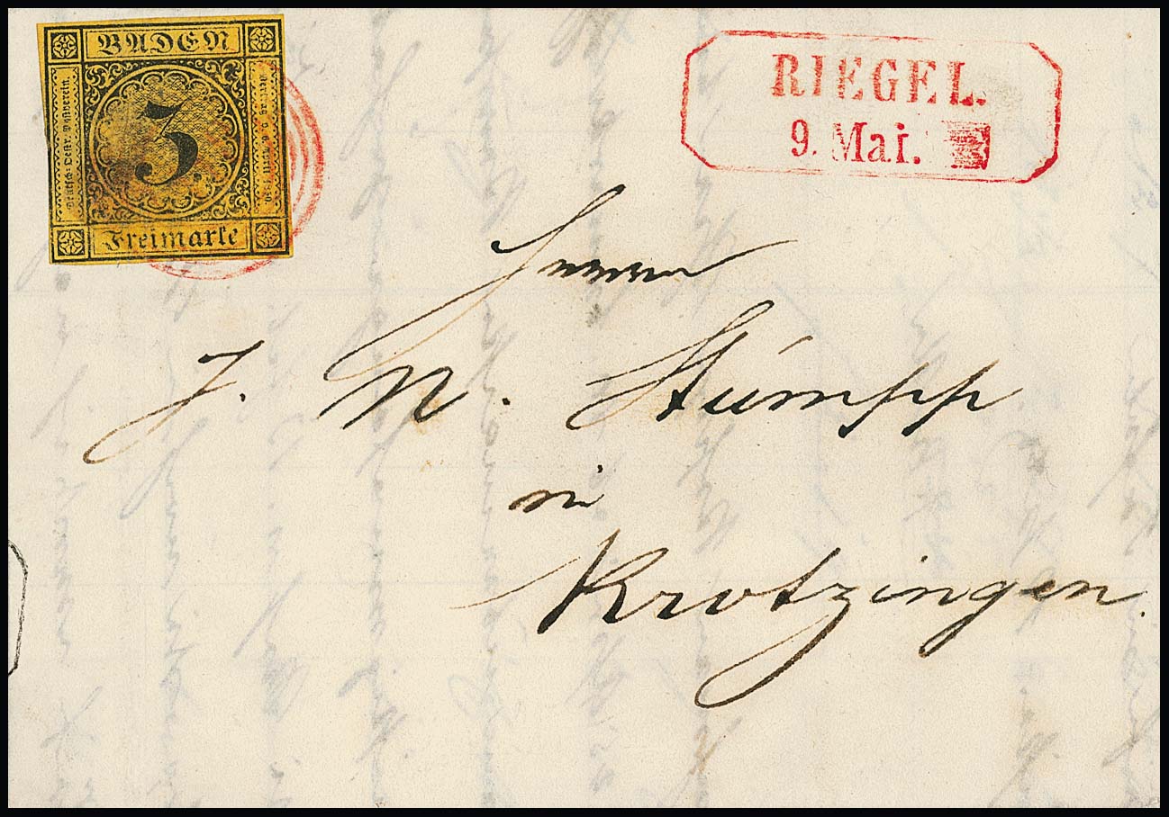 "120" nebst Ra2 "Riegel", je in rot, auf Brief 3 Kr., 1. Auflage (u.a. etwas gerauht). Seltener früher Brief vom 9. Tag der badischen Marken, 9. Mai 1851