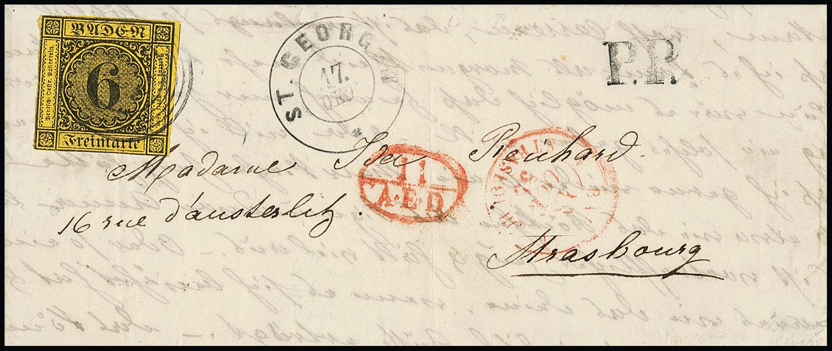 "124" nebst K2 "St. Georgen" auf Auslandsbriefchen mit 6 Kr. schw./gelborange 1855 nach Straßburg