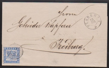 "128" nebst rotem K2 "Schliengen" auf Faltbrief mit voll- bis breitrandiger 3 Kr.