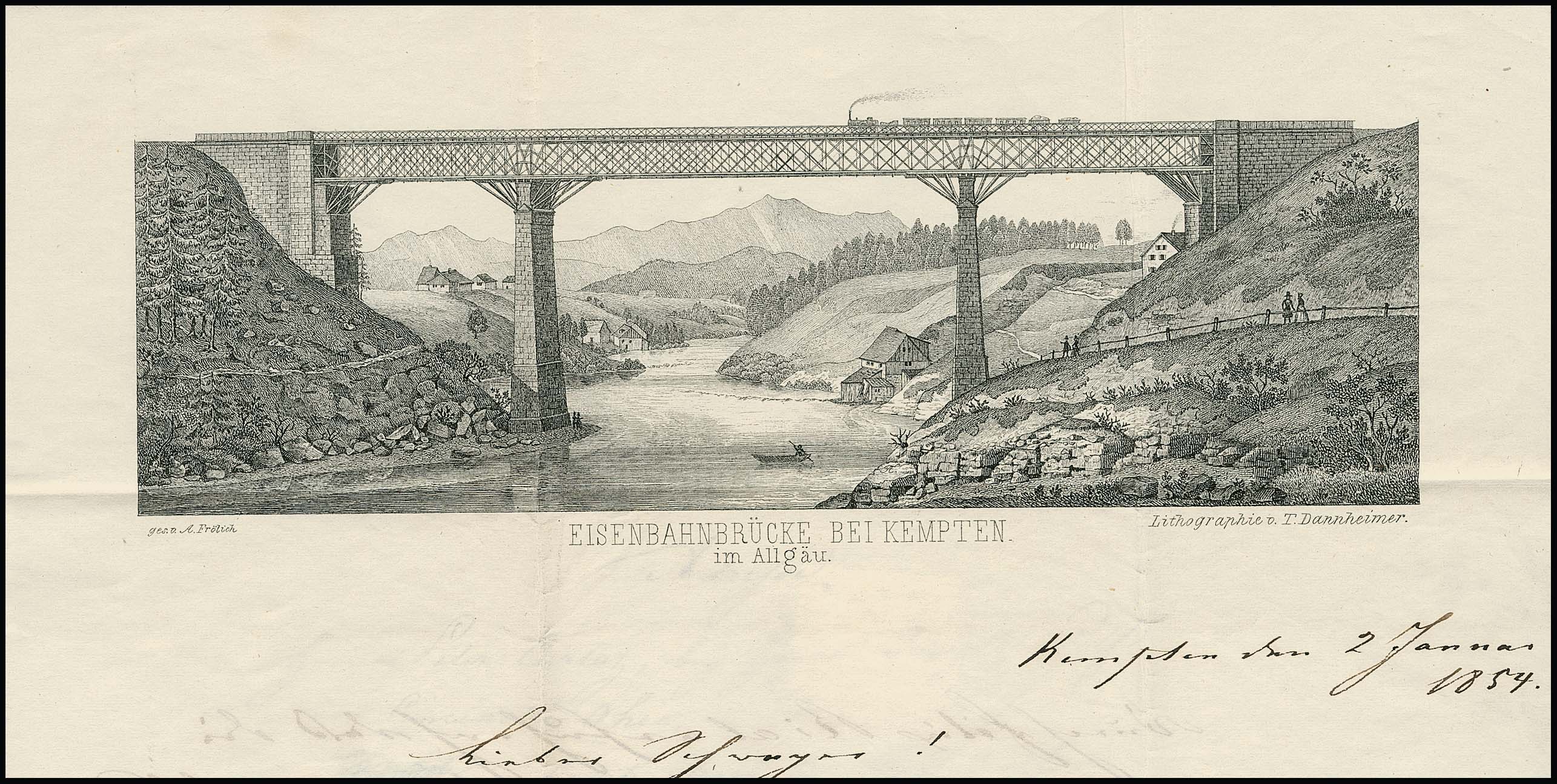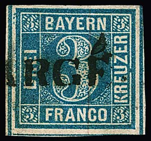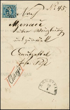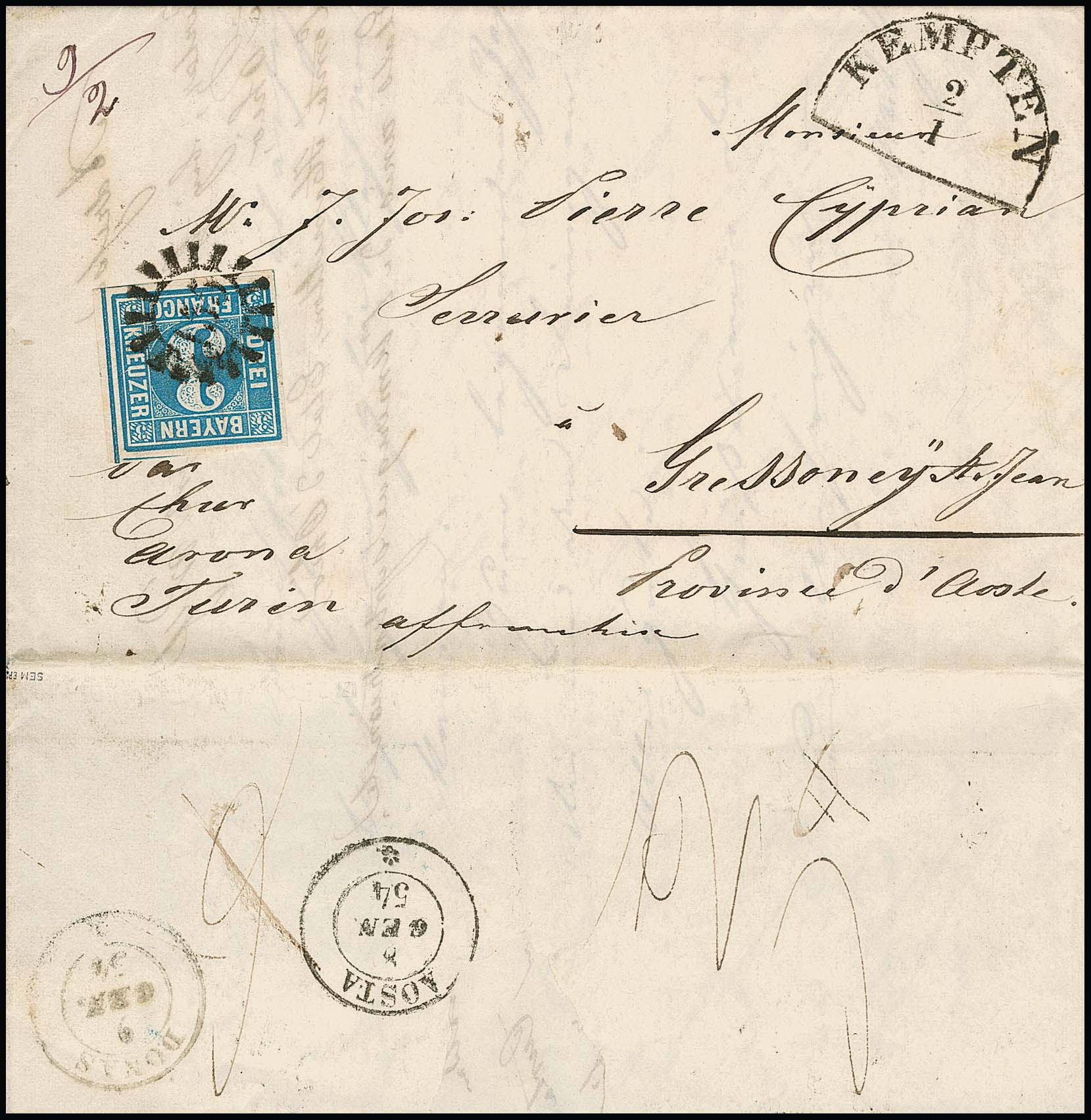 3 Kr. blau, Platte 2, Kabinettstück als sehr seltene Einzelfrankatur auf Teilfrankobrief 1854 mit gMR "155" und HK "Kempten" nach Gressoney St. Jean im Piemont (Italien), gelaufen gemäß handschriftlichem Transit-Vermerk "Par Chur, Arona, Turin", rückseitig die Transitstempel via Zürich, Aosta und Donau. Lediglich frankiert bis zur Schweizer Grenze, das restliche Porto von "6" Kr. für die Schweiz und weiteren "6" Kr. für Italien jeweils rückseitig handschriftlich als in bar bezahltes Weiterfranko (gesamt also "12" Kr. gemäß weiterem hs. rückseitigen Vermerk) bar bezahlt. Teilfranko-Einzelfrankaturen mit der 3 Kr. blau gehören zu den postgeschichtlichen Seltenheiten von Bayern, der vorliegende Beleg ist sehr frisch und ursprünglich erhalten und zeigt zudem innen als Briefkopf einen dekorativen Stahlstich "Eisenbahnbrücke bei Kempten". Sign. mit Attest Sem, aus der 84. Rauhut-Auktion 2004 (4000,- Euro)