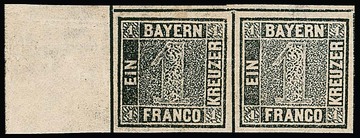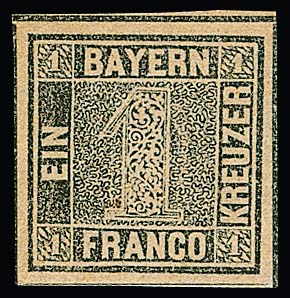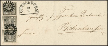 1 Kr. schwarz, Platte I, drei hervorragend breitrandige und farbfrische Luxusstücke auf frischem Brief mit gMR "255" und HK "Ottobeuern" nach Babenhausen. Klare Abstempelung und ungewöhnlich breitrandiger Schnitt gleich aller drei Marken, in dieser dekorativen Optik sicher einer der schönsten Briefe mit drei Exemplaren des "Bayern-Einser". Unterhalb der Frankatur sind interessanterweise noch Gummireste einer vierten Marke zu sehen, möglicherweise war der Brief erst mit einer weiteren Marke (in diesem Fall einer 3 Kr. blau) für die 2. Gewichtsstufe vorfrankiert und diese dann wieder entfernt, da 3 Kr. ausreichend für 1. Gewichtsstufe (es fehlen jedenfalls Gewichtsvermerke für eine höhere Progression oder enthaltene Beilagen). Ein altbekanntes Stück aus den Sammlungen Anderegg (Schwenn 1967, Zuschlag DM 22.000,- + Aufg.) und Dr. Schnapka (Corinphila 1979, Zuschlag 20.000,- SFr. + Aufg.), sign. Bühler, Schwenn, ein lt. unserem Archiv früher vorhandenes Attest Brettl liegt nicht mehr bei. Foto siehe Titelseite