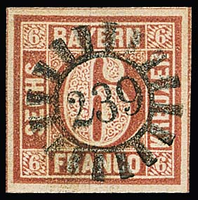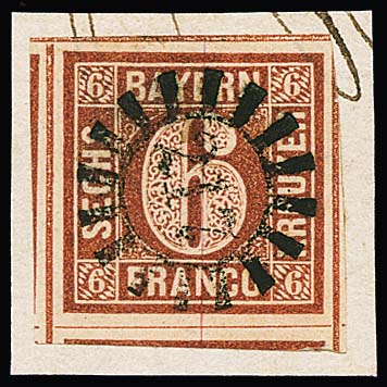 6 Kr. rotbraun, Type I, Luxus-Randstück mit zentrischem gMR "24" (Beilngries), Befundkopie Schmitt
