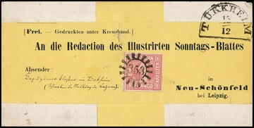 1 Kr. rosa, Prachtstück (unten kl. Knitterspur) auf besonders dekorativer Drucksache, Inhalt plus gelbes Kreuzband, mit besserem gMR "353" und HK "Türkheim" an die "Redaction des Illustrierten Sonntags-Blattes" (später "Henze"-Korrespondenz) nach Neu-Schönefeld bei Leipzig