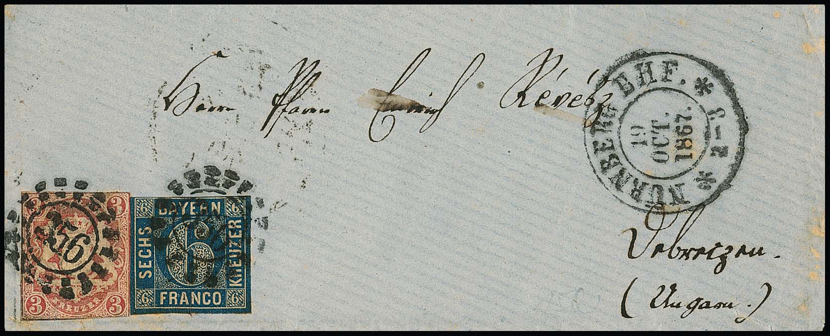 6 Kr. dunkelblau in Mischfrankatur mit Wappen 3 Kr. rosa, beide im sog. "Zwergenschnitt", auf Damencouvert von Nürnberg 1867 nach Debreczin/Ungarn, sign. Brettl