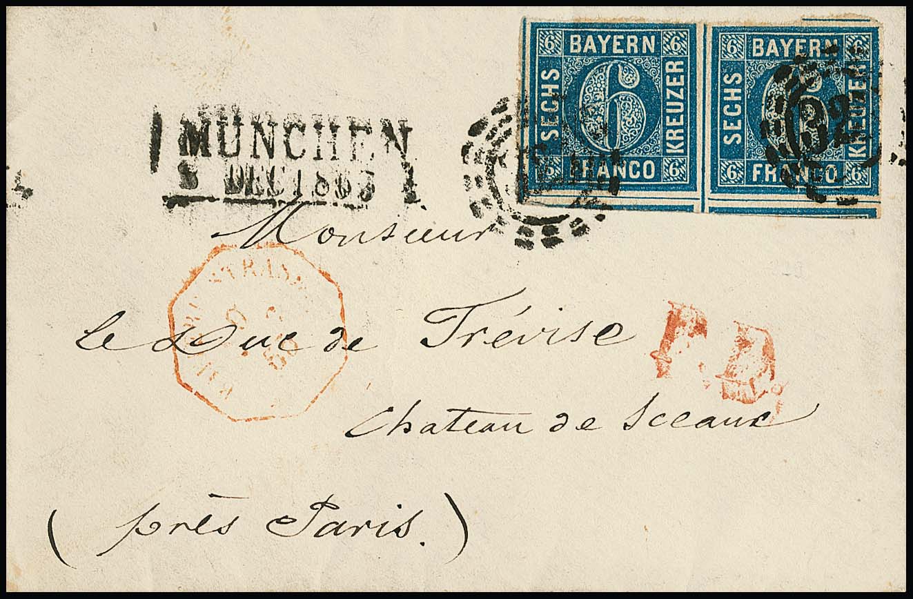 6 Kr. blau, trotz deutlicher Klischeeverschiebung allseits noch voll- bis überrandiges Paar auf prachtvollem Damencouvert von München 1863 nach Frankreich, sign. Sem