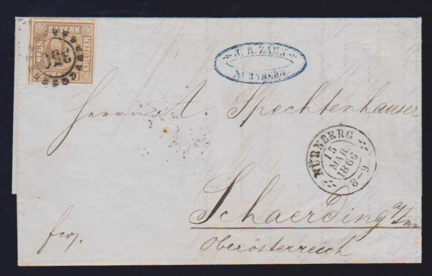 9 Kr. ockerbraun auf Kabinettbrief von Nürnberg 1866 nach Schaerding/Oberösterreich