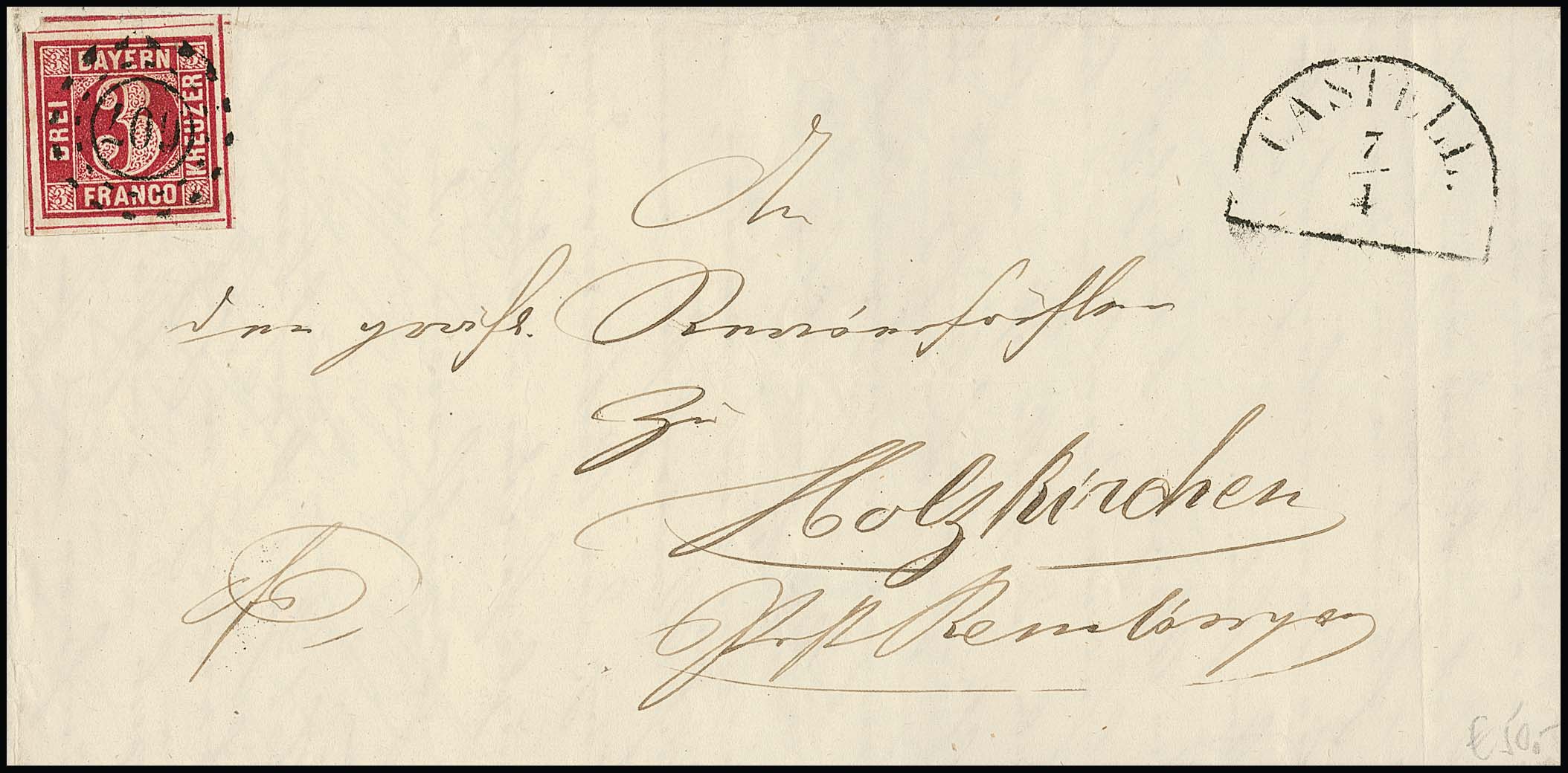 3 Kr. karmin, linke untere Luxus-Bogenecke, vier Schnittlinien, oben Nebenmarke, auf Brief aus Schweinfurt, sign. Sem
