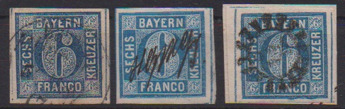 6 Kr. blau, große linke obere Bogenecke mit oMR "32" (kl. Eckbüge ausserhalb des Markenbildes), ferner zwei weitere Exemplare (v. Rand und mit hs. Gerichtsentwertung), sowie Kabinettstück 6 Kr. dunkelblau, zwei Fotoexp. Sem