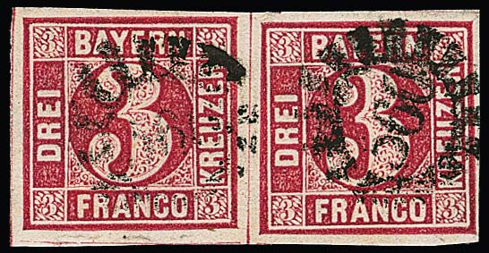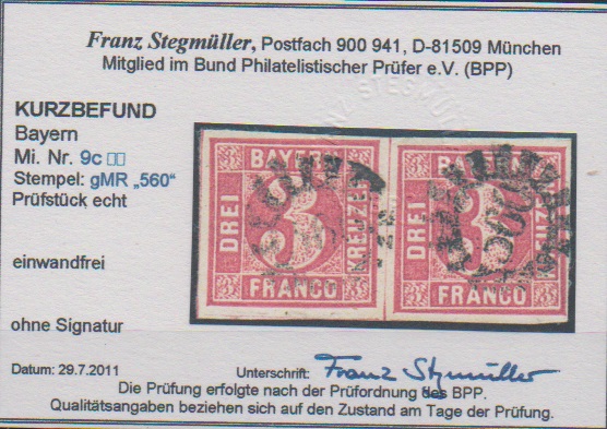 3 Kr. karmin, körniges Druckbild, seltenes unterbewertetes Kabinettpaar mit gMR "560" (Wasserburg), Fotoexp. Stegmüller