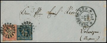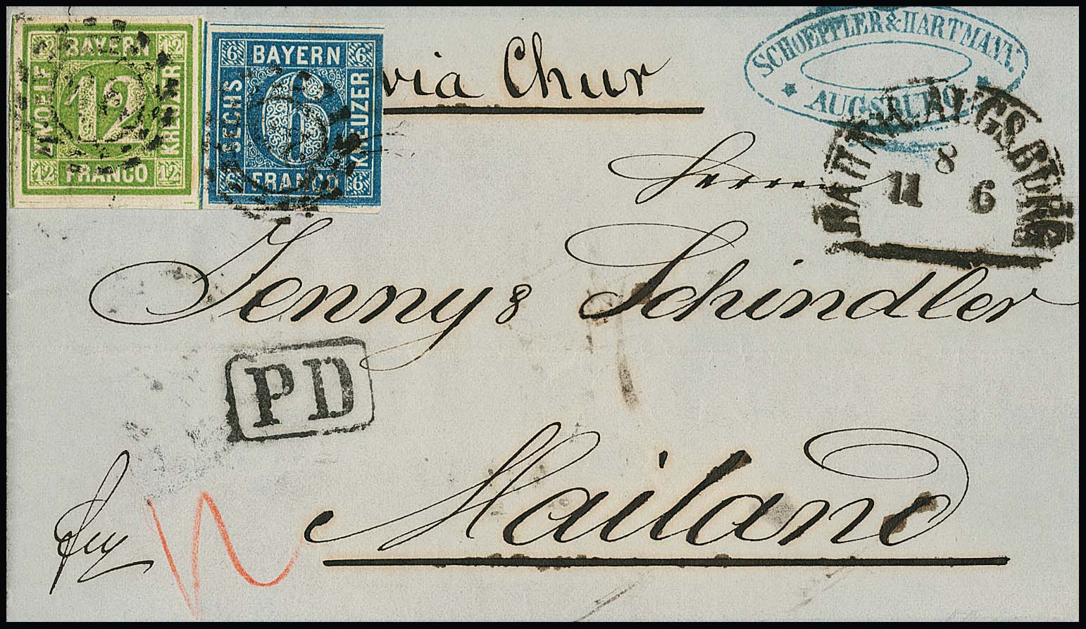 6 Kr. blau (re. etwas Randlinienschnitt) und breitrandiges Kabinettstück 12 Kr. grün auf Faltbrief mit oMR "28" und HK "Bahnh. Augsburg" 1862 nach Mailand, via Schweiz. Tadellos sign. Schmitt