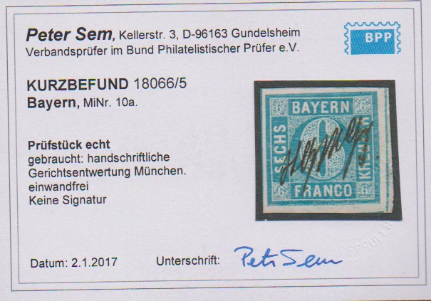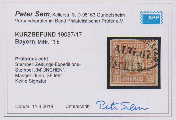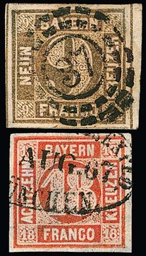 9 Kr. braun, rechtes Luxus-Randstück mit zentr. oMR "37", sowie 18 Kr. orangerot (Mgl., dünn) mit hierauf besserer Entwertung durch Zeitungs-Ovalstempel von München, Sign. bzw. Fotoexp. Sem