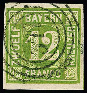 12 Kr. grün, breitrandig, leichte Bugspur, mit seltener Fremdentwertung durch taxischen NS "377" der Werra-Eisenbahn. Sign. Pfenninger und Fotoexp. Brettl