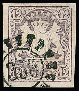 12 Kr. purpur, Kabinettstück mit gMR "356" und gut sichtbarem Plattenfehler "rechte obere Ecke abgeschrägt", sign. Stegmüller. Mi. 200,-