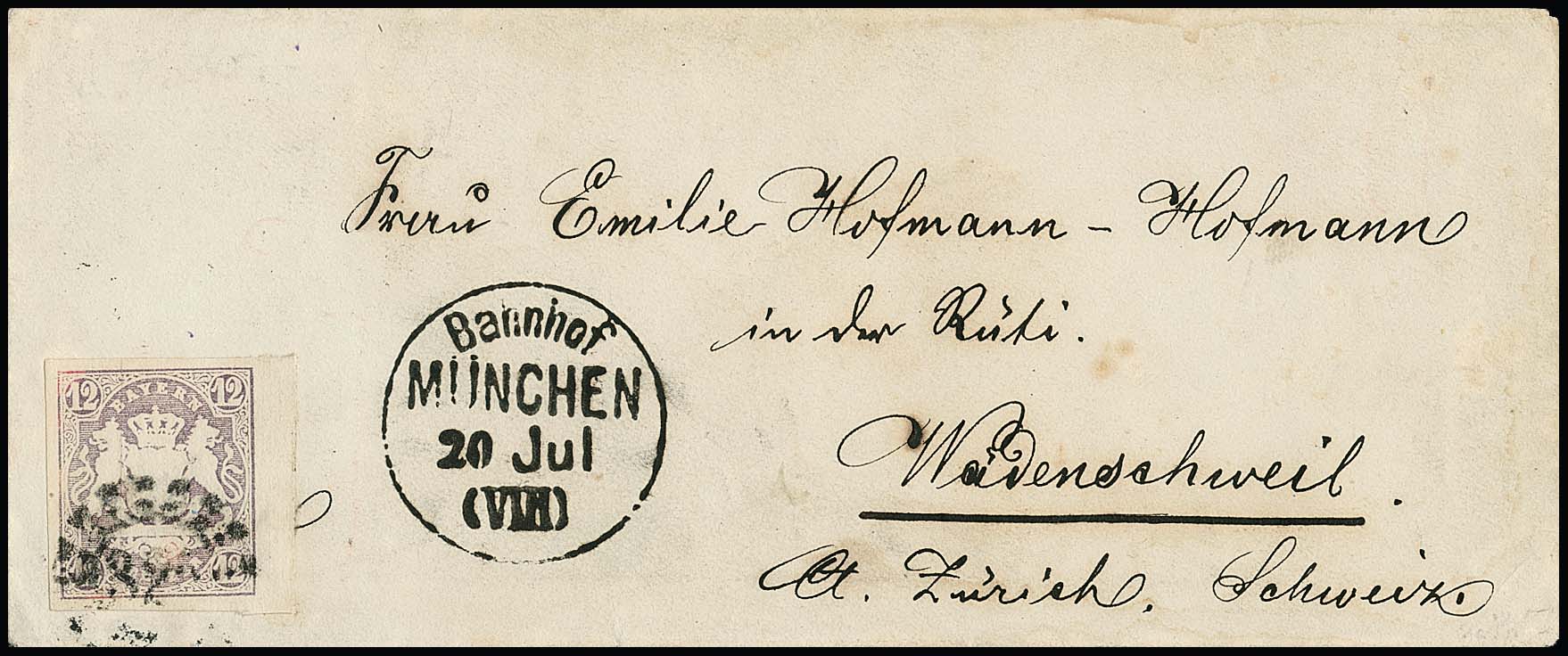 12 Kr. purpur, rechtes Randstück (Reinigungsspuren) mit guten Rändern auf Damencouvert mit oMR "325" und klarem K1 "Bahnhof München" nach Wadenschwil/Schweiz 1868