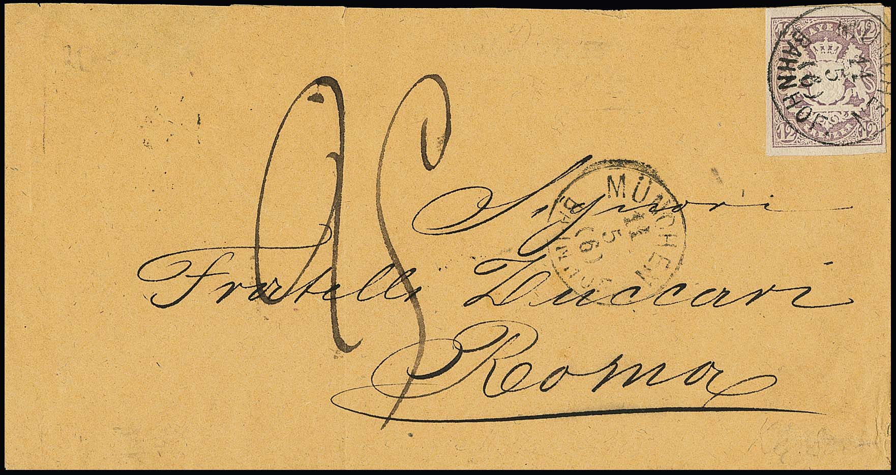12 Kr. purpur, perfektes Exemplar auf beigem Couvert (leichte Mittelfalte ausserhalb) mit K1 "München Bahnhof" 1870 nach Rom/Kirchenstaat, wobei der Empfänger noch 25 Cent. für den Kirchenstaat-Inlands-Anteil bezahlen mußte