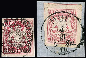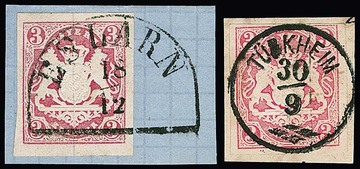 3 Kr. rosa, je perfekte Exemplare auf zwei Briefen, einmal von Lindau im Grenzrayon nach Romanshorn/Schweiz, sowie aus Braunenburg 1867, jedoch ohne Ausgabestempel und Marke nur handschriftlich mit Datum "9/11" entwertet
