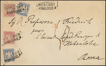 3 Kr. rosa und 7 Kr. hellblau jeweils per zwei (teils Schnittfehler), kurios original mit Mehlkleister aufgeklebt, auf Briefcouvert (rs. fehlt ein Klappenteil) der 2. Gewichtsstufe von München als Teilfranko nach Rom, der Empfänger zahlte noch 50 Cent. für den Kirchenstaat, rs. Bischofssiegel
