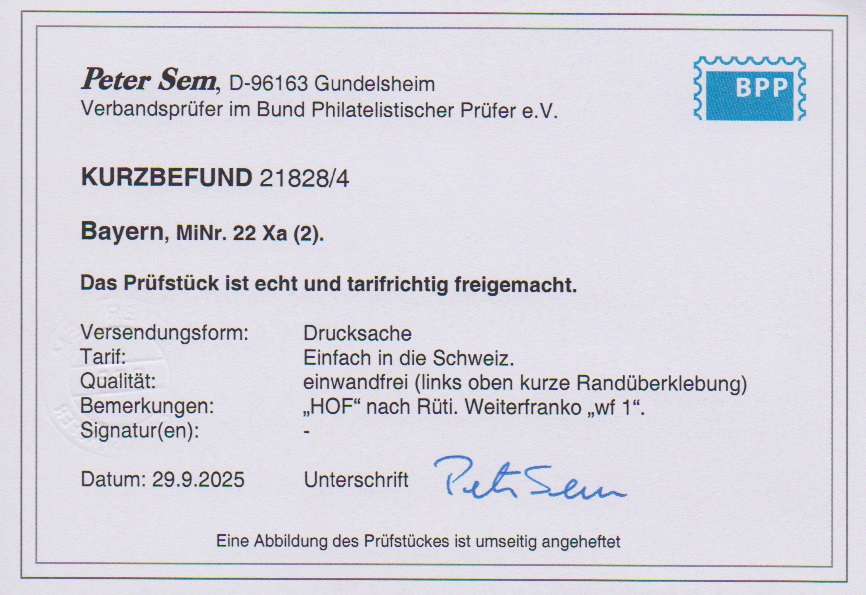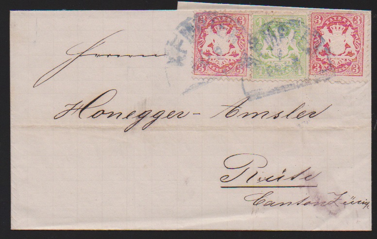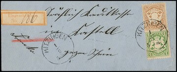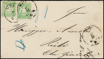 Zwei Briefe aus gleicher Korrespondenz je nach Rütli b. Zürich/Schweiz. Einmal Auslands-Drucksache aus Hof mit zwei 1 Kr. grün (v. 16.3. und 17.3.1871, letztere mit hs. Vermerk "noch 1" nachfrankiert), Fotoexp. Sem, sowie Brief mit 1 Kr. grün und zweimal 3 Kr. rosa (oben min. bestoßen) aus Kempten, sign. Sem