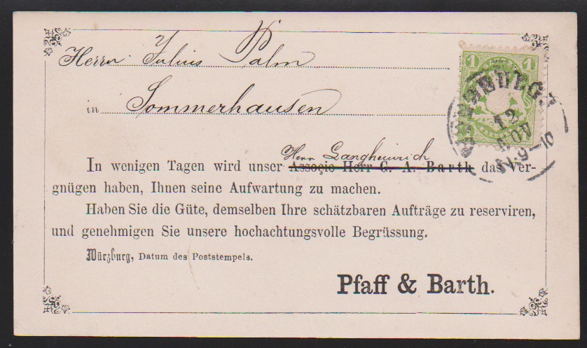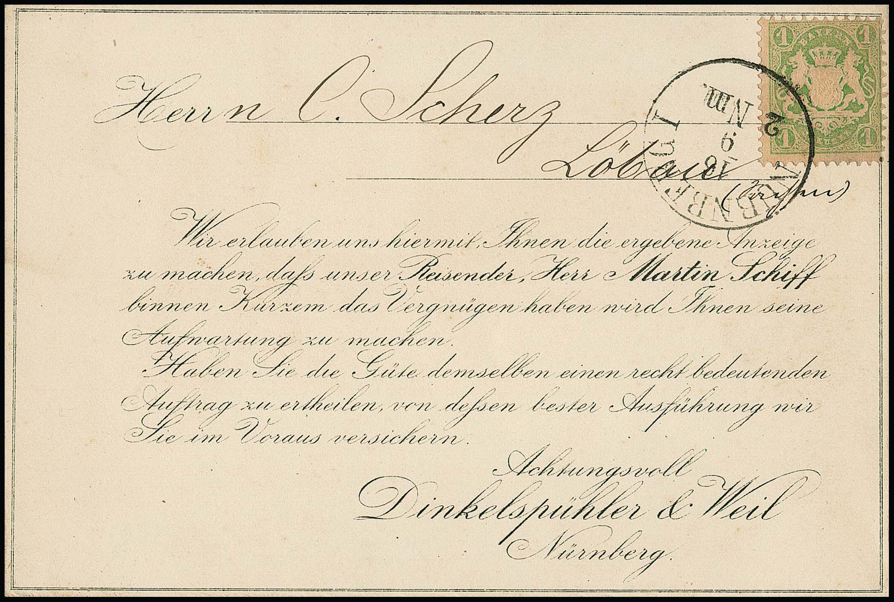 1 Kr. grün (sign. Brettl) bzw. dunkelgrün je einzeln auf zwei dekorativen Vertreterkarten aus Nürnberg bzw. Würzburg