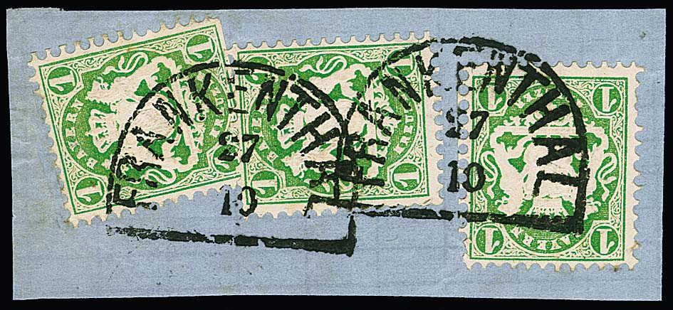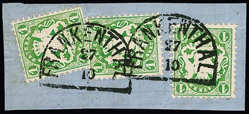 1 Kr. bläulichgrün, drei Exemplare mit HK "Frankenthal" (eine Marke Zahnfehler durch Scherentrennung) auf dekor. Briefstück, sign. Brettl