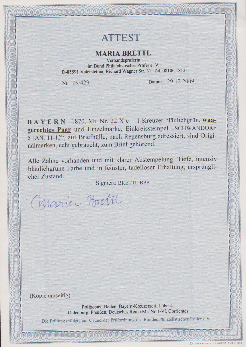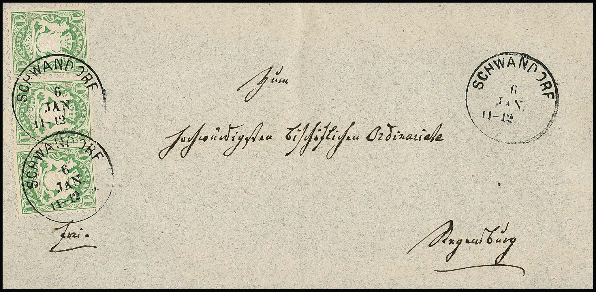 1 Kr. bläulichgrün, waager. Paar und Einzelstück, mit K1 "Schwandorf" auf Luxusbrief nach Regensburg (dekor. Adresse), Attest Brettl