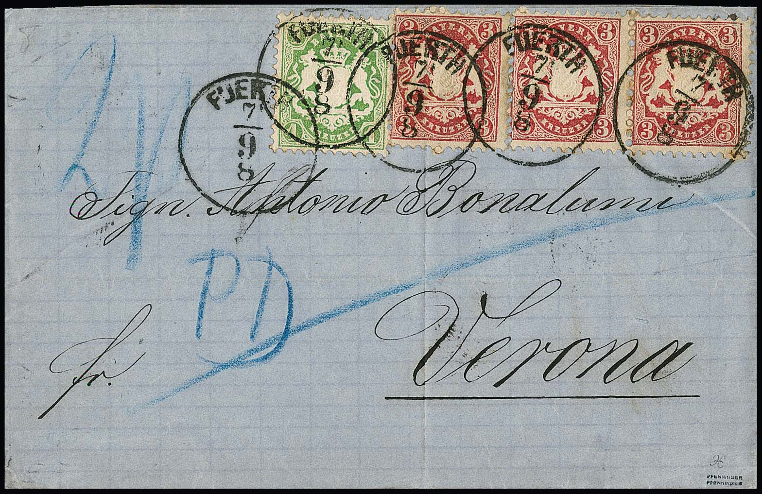 1 Kr. bläulichgrün, Prachtstück, nebst Paar und Einzelstück (dieses kl. Zahnfehler) 3 Kr. karmin, auf Brief mit K1 "Fürth" nach Verona, sign. Pfenninger, Fotoexp. Sem