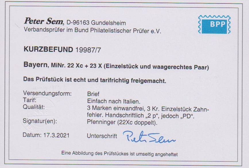7 Kr. preußischblau (punkthell) sowie kornblumenblau (Kabinett) je gestempelt, Fotoexp. Sem bzw. Brettl. Mi. 1650,-
