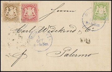 1 Kr. hellgrün, 3 Kr. rosa und 6 Kr. ockerbraun (wenige getönte Zahnspitzen und "eckrund") auf Faltbrief von München 1872 nach Palermo
