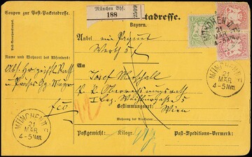 1 Kr. gelbgrün, 3 Kr. rosa und 18 Kr. mattziegelrot (stärker "eckrund", 3 Kr. Knitter) auf kpl. gelber Paketkarte von München nach Wien