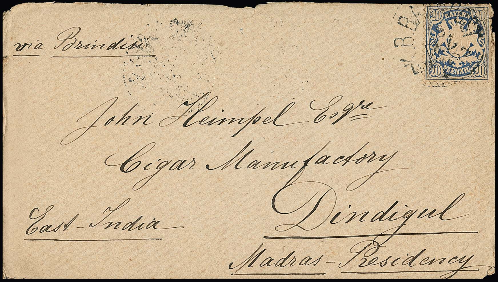 20 Pfg. blau auf Couvert mit Inhalt 1880 von Lindau nach Dindigul/Madras (Indien) an eine Zigarrenfabrik. Trotz der Mängel an Marken und Couvert sehr seltene Destination!