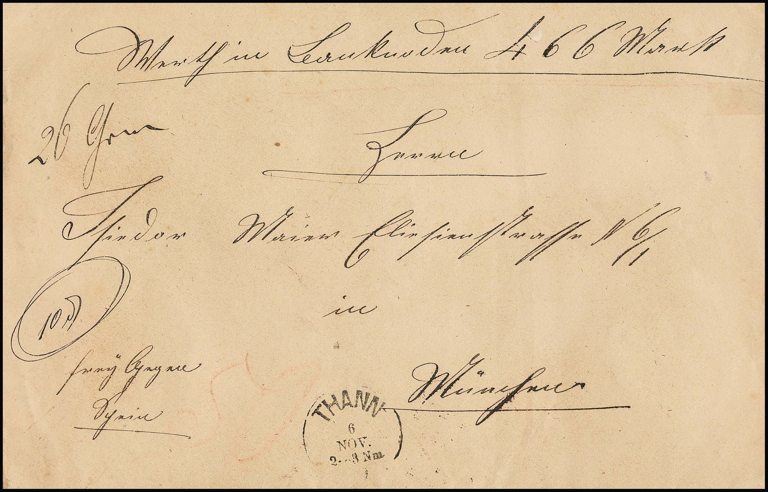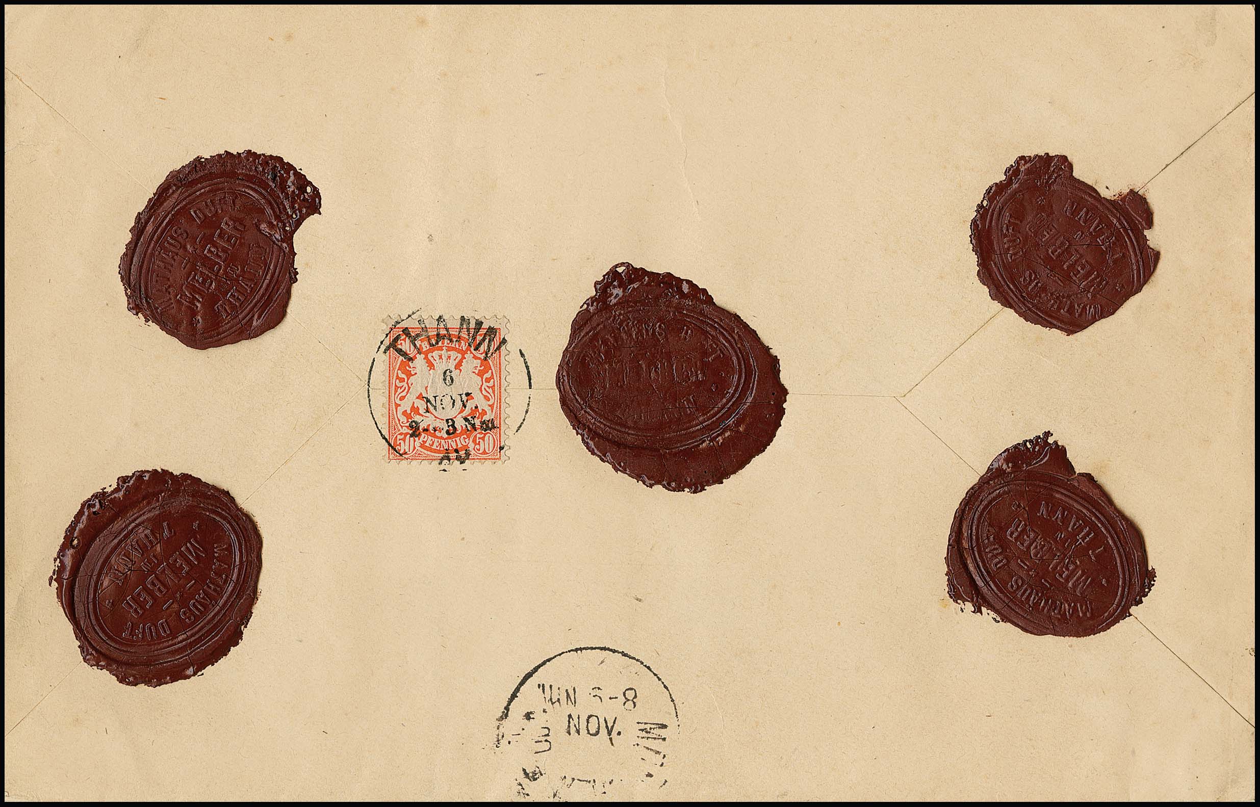 50 Pfg. dunkelziegelrot, tadellos, rückseitig als gute Einzelfrankatur auf Wertbrief mit K1 "Thann". Mi. 2200,-