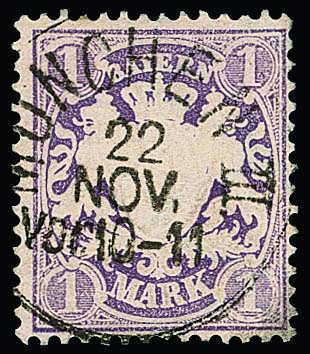 1 Mk. purpur, Kabinettstück mit deutlich sichtbarem Plattenfehler "M und A von MARK verbunden", zentr. K1 "München", sign. Sem, Pfenninger. Mi. 250,-